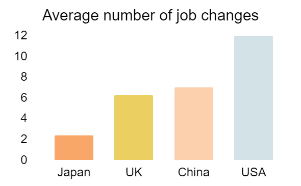 According to a survey conducted by the Japanese Ministry of Health, Labour and Welfare in 2020, the average number of times a person changes jobs during their career is about 2.4 times. This is in stark contrast to US where the average number of jobs held by a person in the US over their lifetime is about 12 according to the United States Bureau of Labor Statistics (BLS).